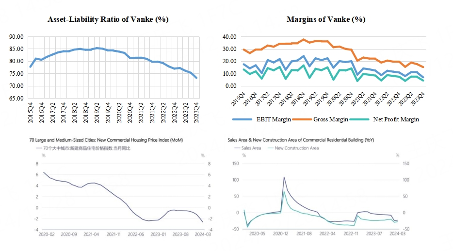 However, in the current landscape, declining performance, dim sales prospects in the real estate market sales, and ongoing liquidity challenges have contributed to the persistent decline in stock prices of publicly listed real estate companies. Vanke’s stock price has plummeted significantly, reaching a new low of 6.7 yuan as of the closing on April 19th, 2024. The company’s total market capitalization is now less than 80 billion yuan, representing only 18% of the peak market value in 2018. Notably, back in October 2023, Vanke’s multiple US dollar bonds experienced a sharp decline in prices, with some longer-duration bonds falling to less than 50% of face value. This alarming trend has been interpreted as a potential harbinger of a real estate company crisis, as a result, the prevailing pessimistic sentiment has been transmitted to the domestic bond market, leading to a continued decline of Vanke’s domestic bond prices.